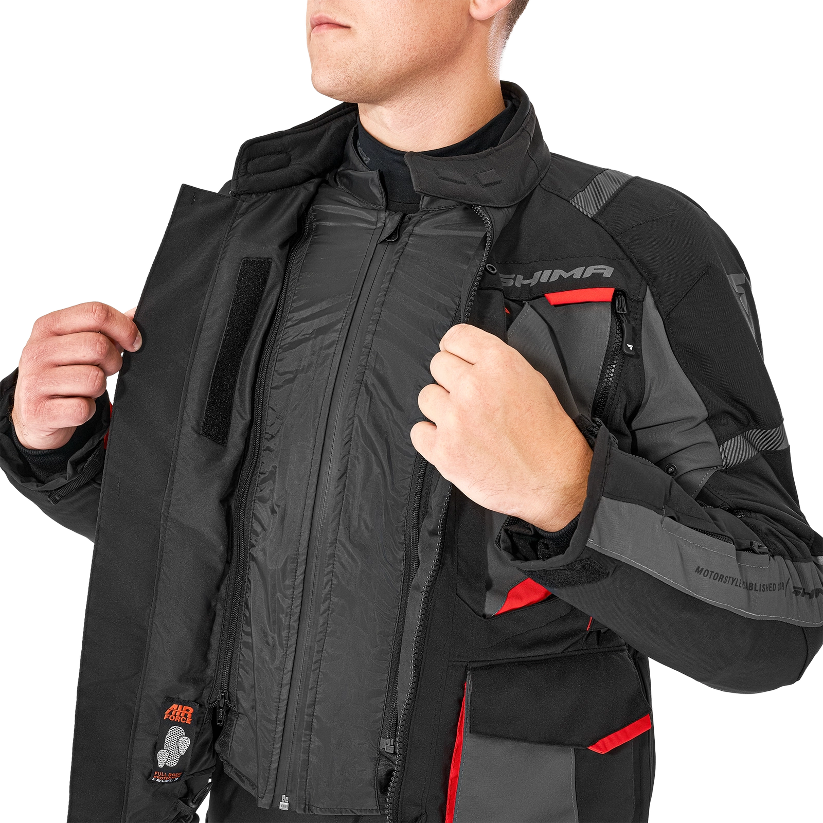 Elastyczne i zapewniające najwyższy poziom bezpieczeństwa protektory AirForce level-2 zostały zastosowane w najbardziej narażonych na urazy miejscach, czyli plecach, barkach i łokciach. Pod wpływem temperatury ciała dopasowują się do niego i nie ograniczają ruchów motocyklisty. Protektory znajdują się w dedykowanych kieszeniach dzięki czemu można je łatwo wyjąć w razie potrzeby. Dodatkowo, kurtkę można doposażyć w protektor klatki piersiowej, maksymalizując poziom bezpieczeństwa.