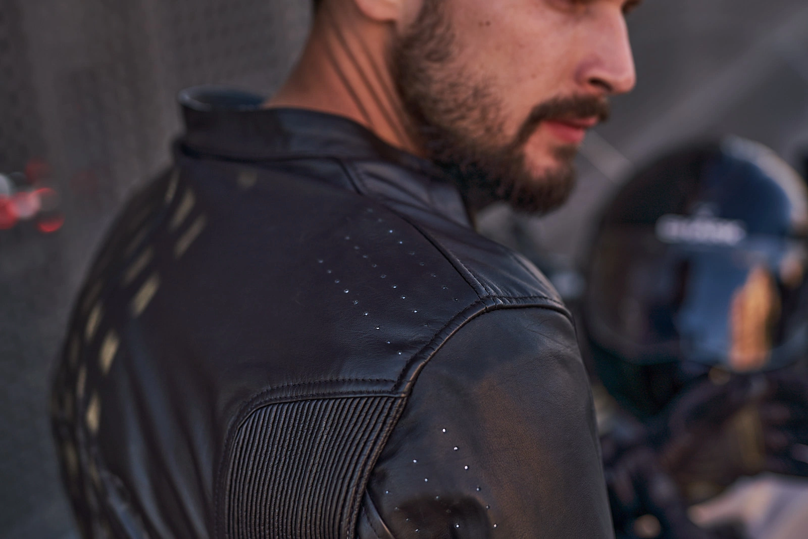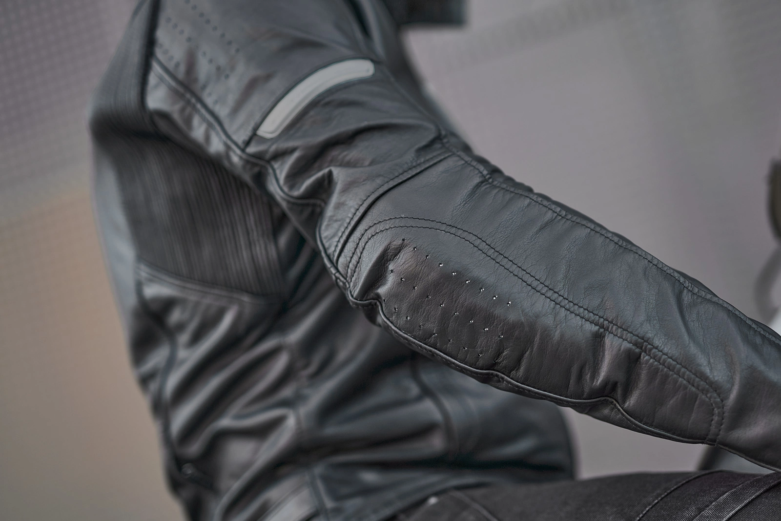Wzdłuż zamka błyskawicznego przebiega główny panel wentylacyjny. Współpracuje on z licznymi, dyskretnymi perforacjami w skórze oraz zintegrowanymi zamkami, które dbają o optymalny komfort termiczny i doprowadzają tlen na całej powierzchni kurtki. Miękka, bawełniana podszewka odprowadza wilgoć i bierze udział w wentylacji.