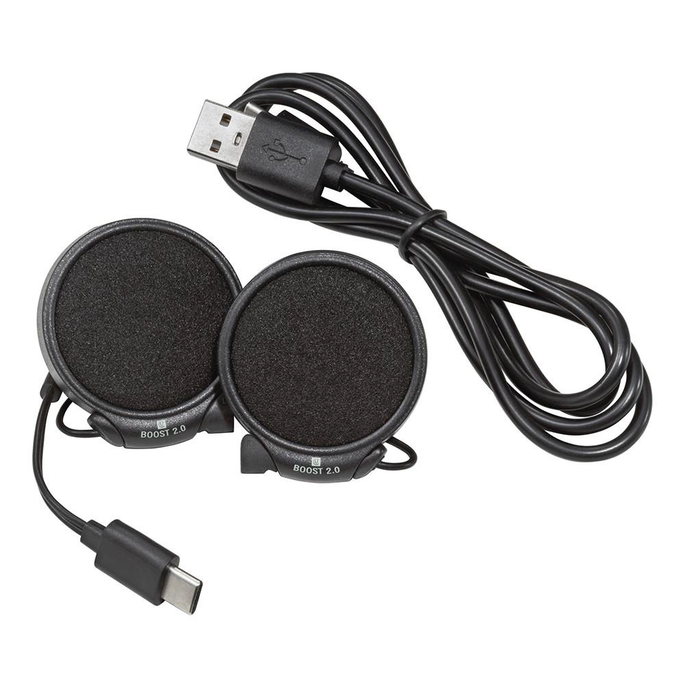 Głośniki Boost 2.0 gwarantują najwyższą jakość dźwięku dzięki zastosowaniu przetworników klasy premium o średnicy 40 mm. Wbudowana funkcja BassBoost oraz możliwość regulacji korektora graficznego pozwalają na dostosowanie brzmienia do indywidualnych preferencji użytkownika. Dzięki podwójnym mikrofonom z zaawansowaną technologią redukcji szumów ABF prowadzenie rozmów telefonicznych staje się wyjątkowo komfortowe i wyraźne. Interkom umożliwia także wielozadaniowość audio, co pozwala jednocześnie słuchać ulubionych utworów muzycznych, korzystać z nawigacji GPS i pozostawać w kontakcie z innymi użytkownikami.