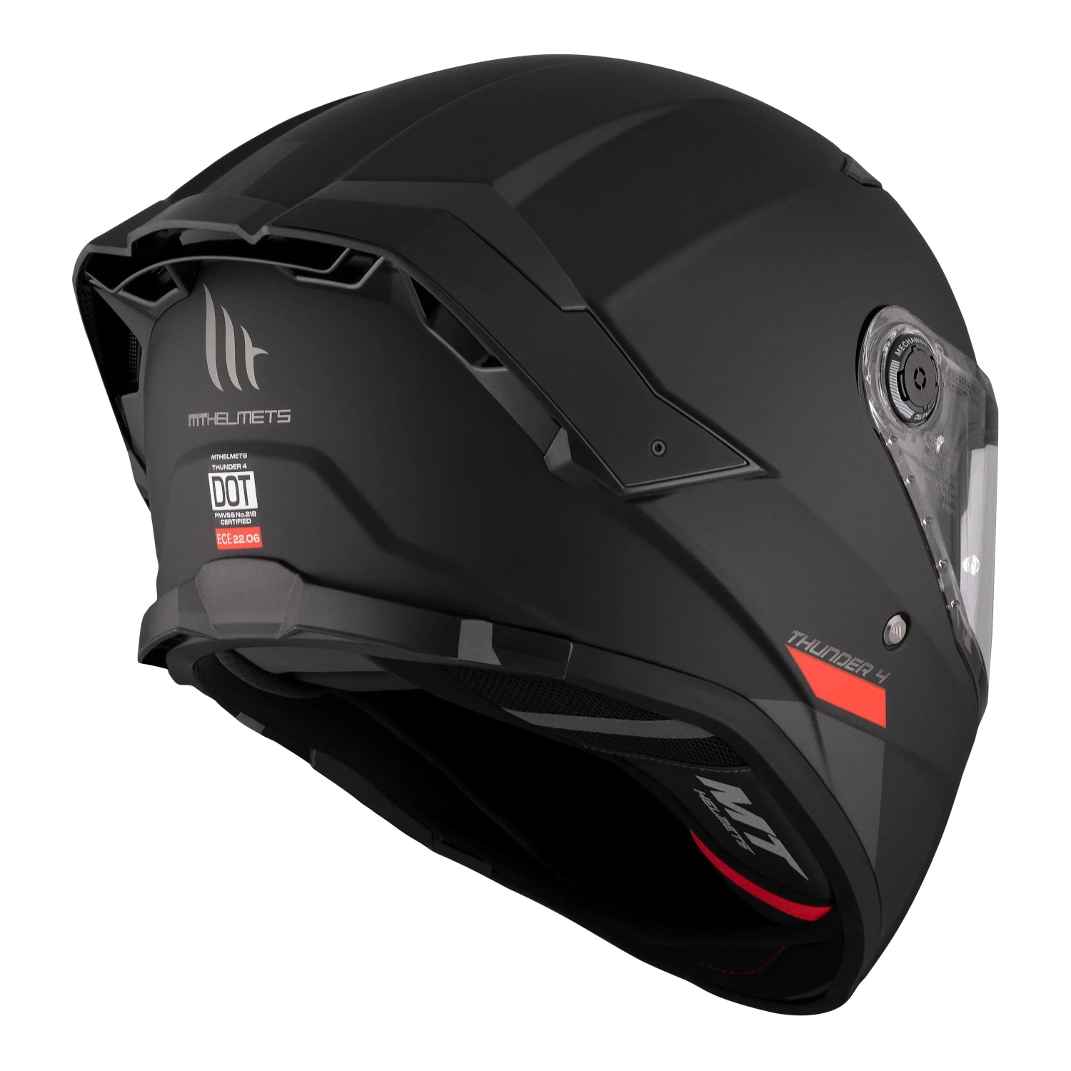 Kask spełnia rygorystyczną normę ECE R22.06, która obejmuje aspekty tłumienia energii przy uderzeniach oraz odporność na pęknięcia. Skorupa kasku MT Thunder 4 SV, o mocno aerodynamicznym kształcie, została wykonana w technologii High Impact Resistant Polymer, czyli z odpornego na uderzenia polimeru. Ponadto, kask wyposażony jest w demontowalny tylny spoiler, dzięki czemu zachowuje stabilność nawet przy dużych prędkościach.