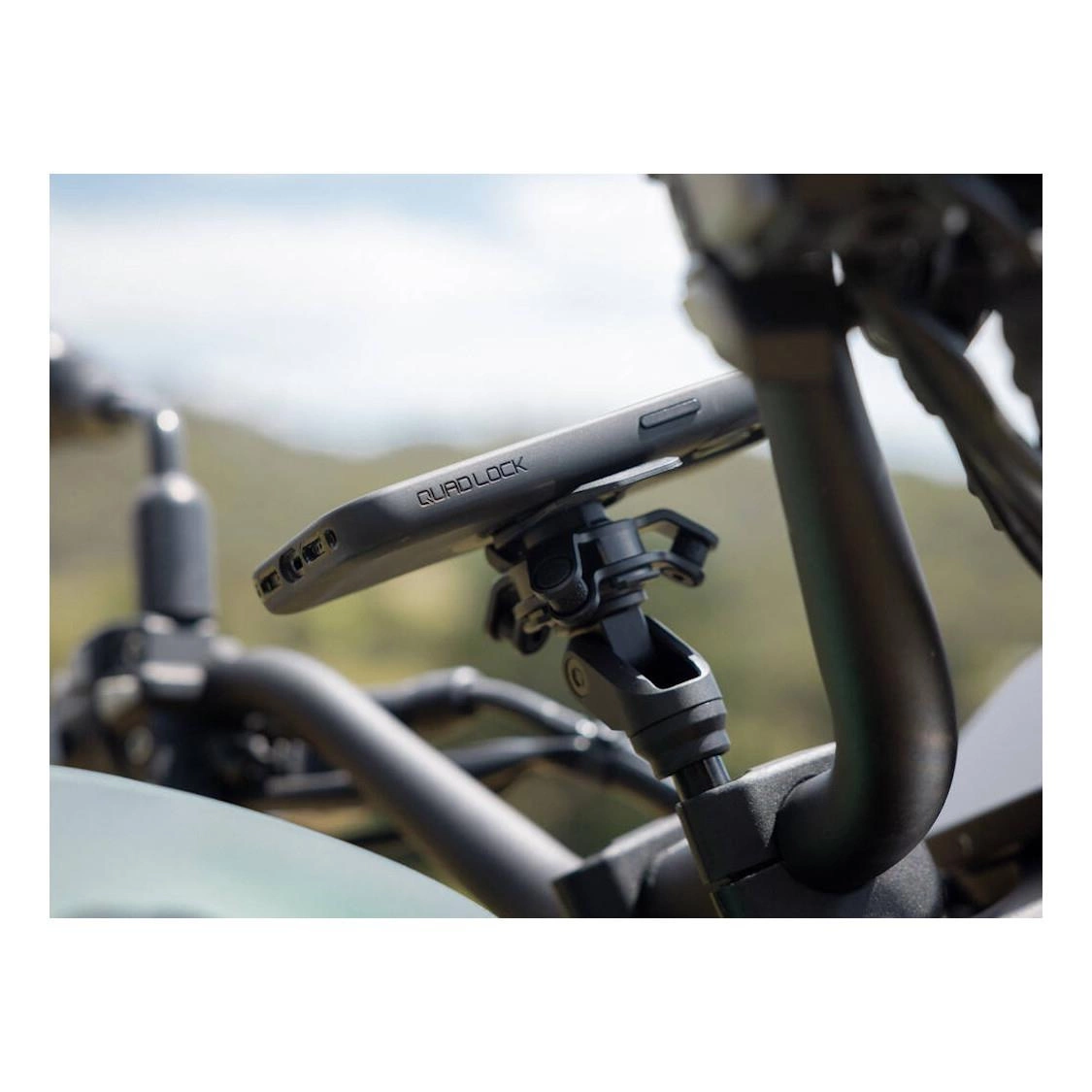 Uchwyt montażowy Quad Lock wykonano z nylonu wzmocnionego włóknem szklanym oraz stali o wysokiej wytrzymałości, co zapewnia pewne mocowanie. Podstawa jest przeznaczona do montażu w wieżyczce kierownicy, gdzie zastępuje istniejącą śrubę zacisku kierownicy M8. Dzięki systemowi regulacji możliwe jest dostosowanie położenia uchwytu w zakresie 135°, a zmiana kąta montażu odbywa się bez konieczności demontażu, przy użyciu dołączonego klucza imbusowego. Specjalne elementy zapobiegające obracaniu się zapewniają stabilność mocowania, dzięki czemu urządzenie pozostaje stabilnie na swoim miejscu, niezależnie od warunków jazdy.