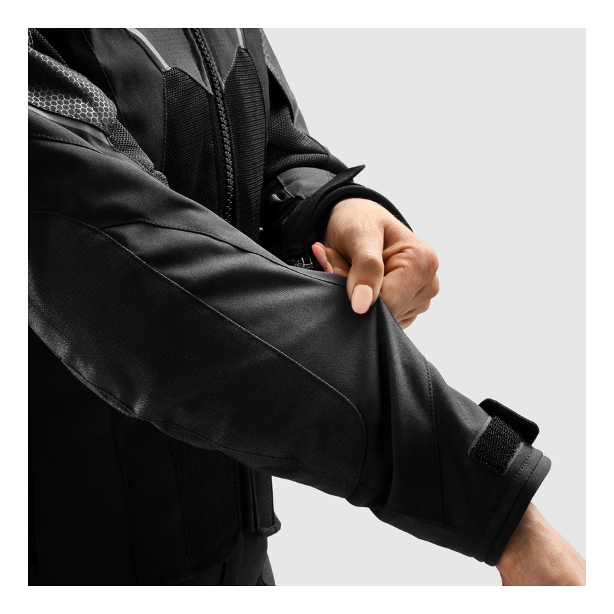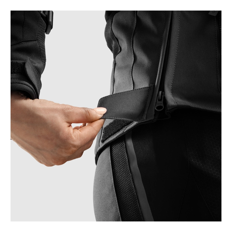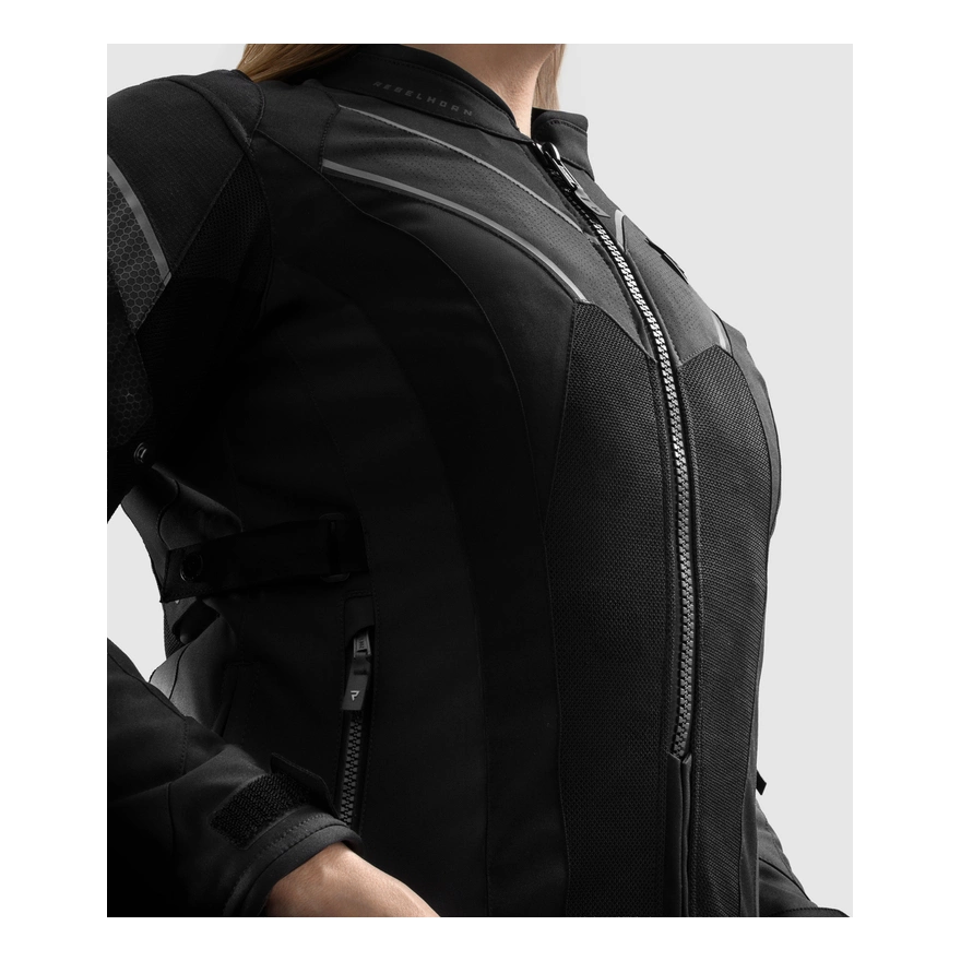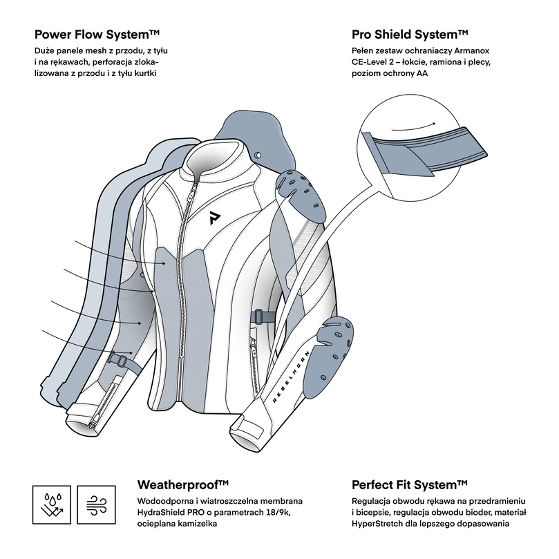 Elementy odblaskowe zwiększają widoczność motocyklistki po zmroku i w trudnych warunkach atmosferycznych. Regulacje w okolicach bicepsów, mankietów, talii i pasa pozwalają na precyzyjne dopasowanie do sylwetki. Dwa zamki – krótki i 360° – umożliwiają połączenie ze spodniami Rebelhorn. Dodatkowo dwie zewnętrzne kieszenie na zamek i jedna wodoodporna wewnątrz kurtki zapewniają szybki dostęp do najpotrzebniejszych rzeczy.