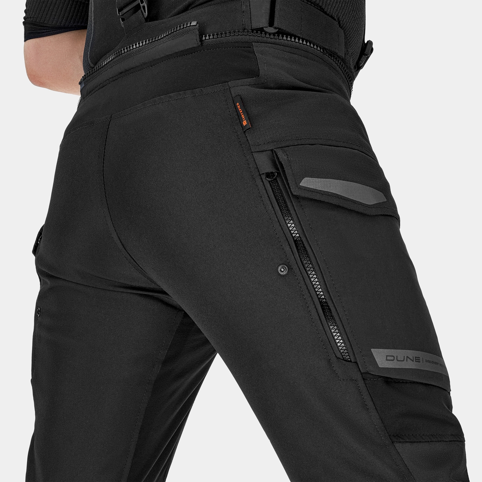 Spodnie motocyklowe Shima Dune zostały wyposażone w liczne elementy odblaskowe Night Vision System, dzięki którym motocyklista jest lepiej widoczny na drodze. Wodoodporne kieszenie cargo na biodrach zapewniają bezpieczne przechowywanie drobnych przedmiotów, takich jak telefon, portfel czy dokumenty. Dodatkowo spodnie oferują możliwość doposażenia w opcjonalne szelki. Szeroka gama kolorystyczna pozwala dopasować je do kurtki, motocykla oraz własnego stylu, łącząc funkcjonalność z indywidualnym stylem.