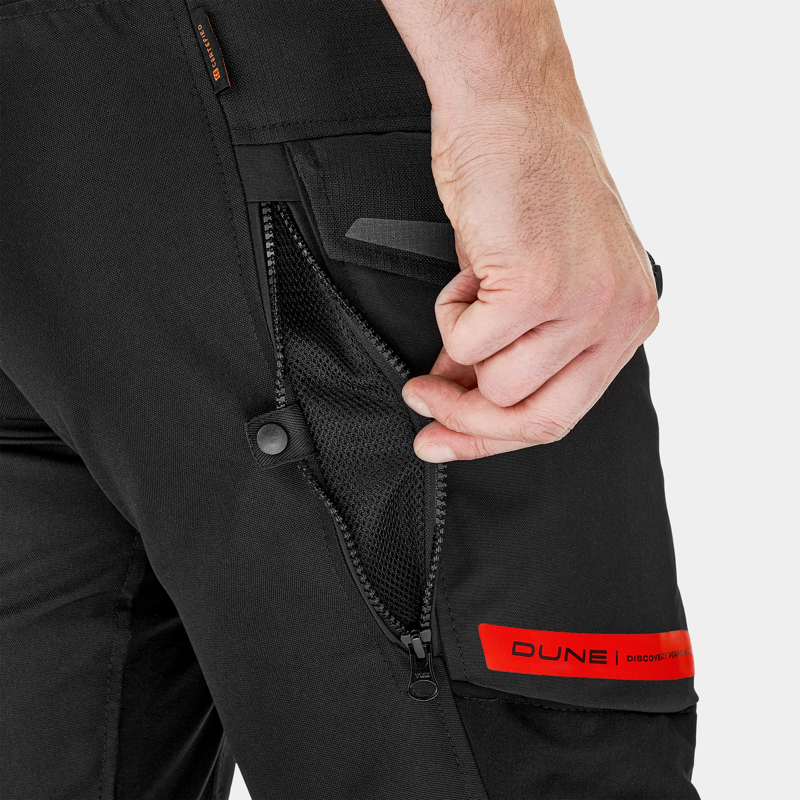Spodnie motocyklowe Shima Dune zostały wyposażone w liczne elementy odblaskowe Night Vision System, dzięki którym motocyklista jest lepiej widoczny na drodze. Wodoodporne kieszenie cargo na biodrach zapewniają bezpieczne przechowywanie drobnych przedmiotów, takich jak telefon, portfel czy dokumenty. Dodatkowo spodnie oferują możliwość doposażenia w opcjonalne szelki. Szeroka gama kolorystyczna pozwala dopasować je do kurtki, motocykla oraz własnego stylu, łącząc funkcjonalność z indywidualnym stylem.