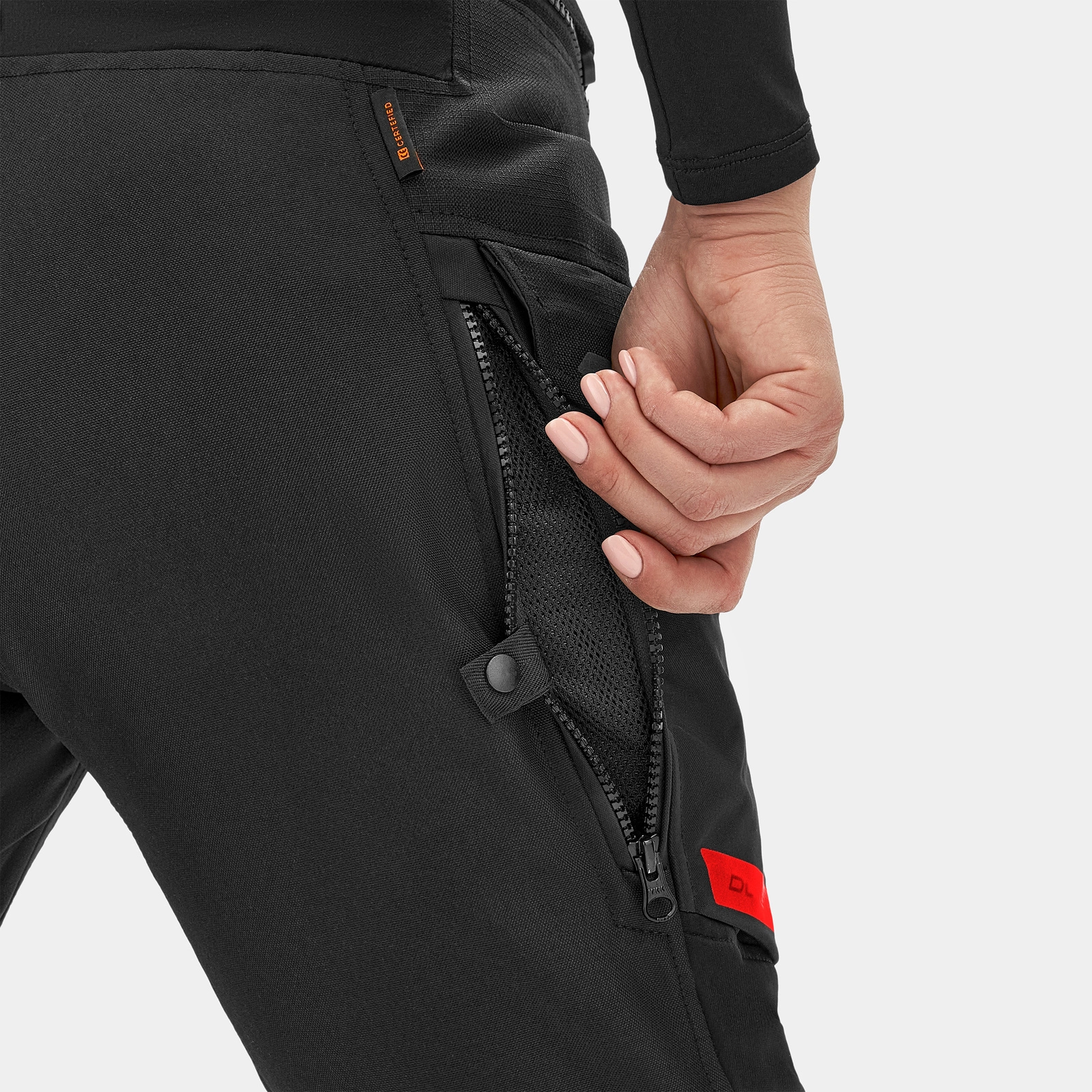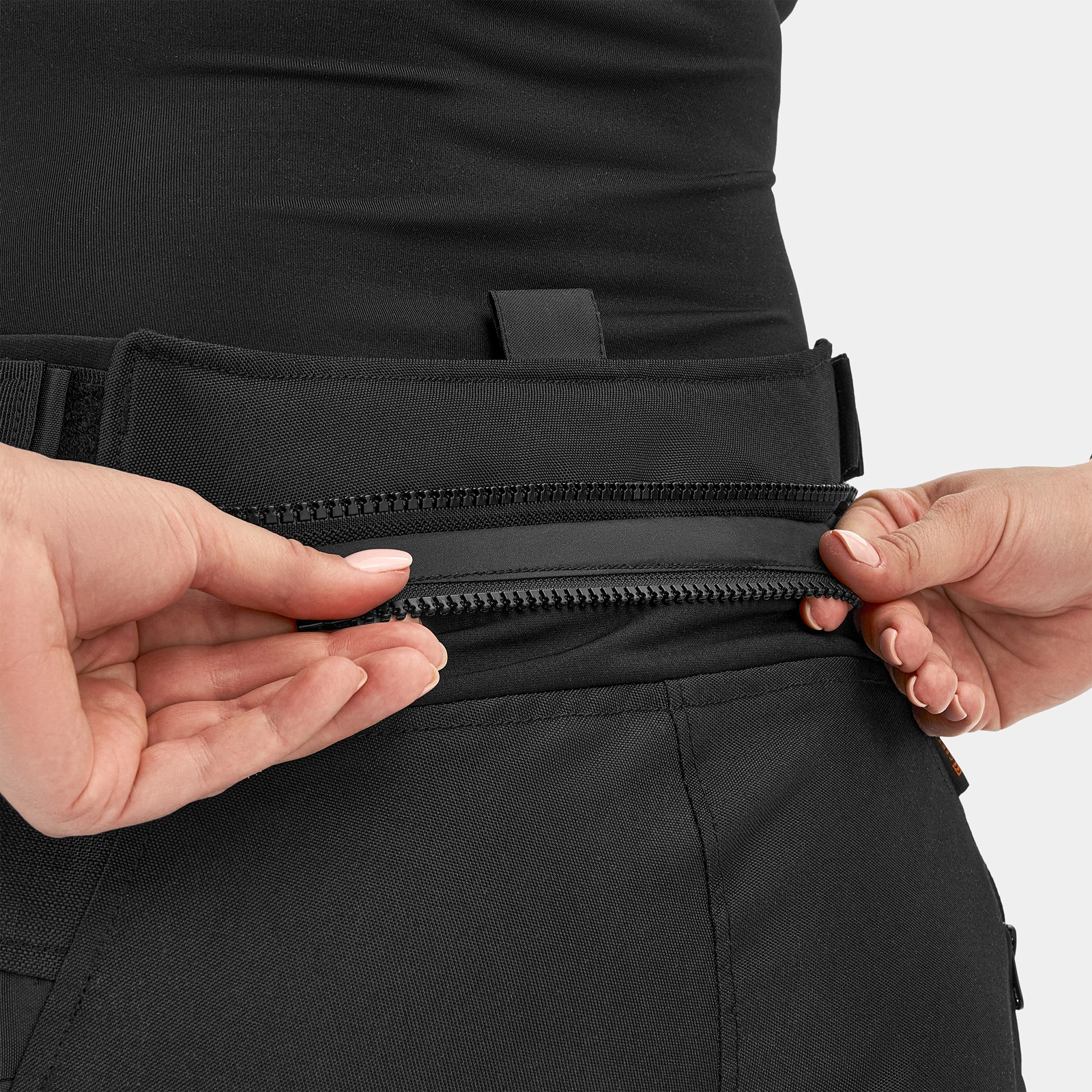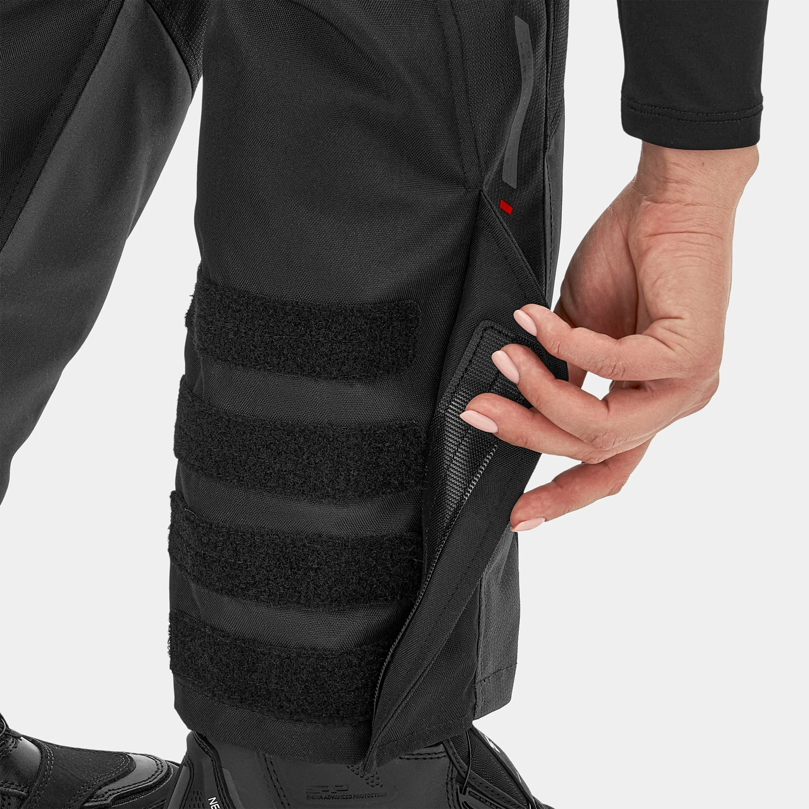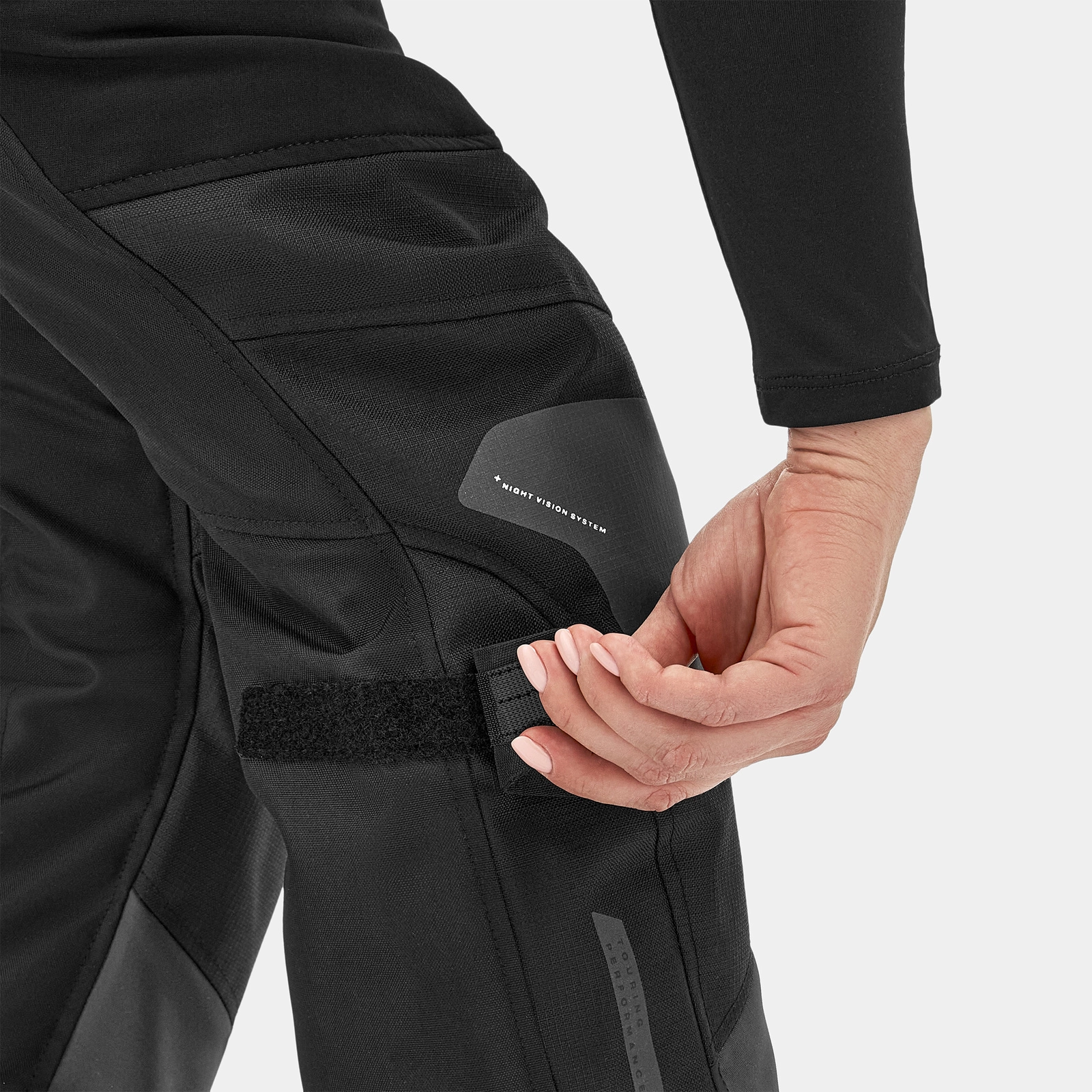 Panele odblaskowe Night Vision System znacząco poprawiają widoczność motocyklistki po zmroku i w niesprzyjających warunkach pogodowych. Na biodrach znajdują się wodoodporne kieszenie cargo, idealne do przechowywania drobiazgów, takich jak dokumenty, telefon czy portfel, z gwarancją ochrony przed wilgocią. Spodnie można doposażyć w opcjonalne szelki, a szeroka gama kolorystyczna pozwala dopasować je do kurtki, motocykla oraz własnego stylu, podkreślając indywidualny charakter każdej motocyklistki.