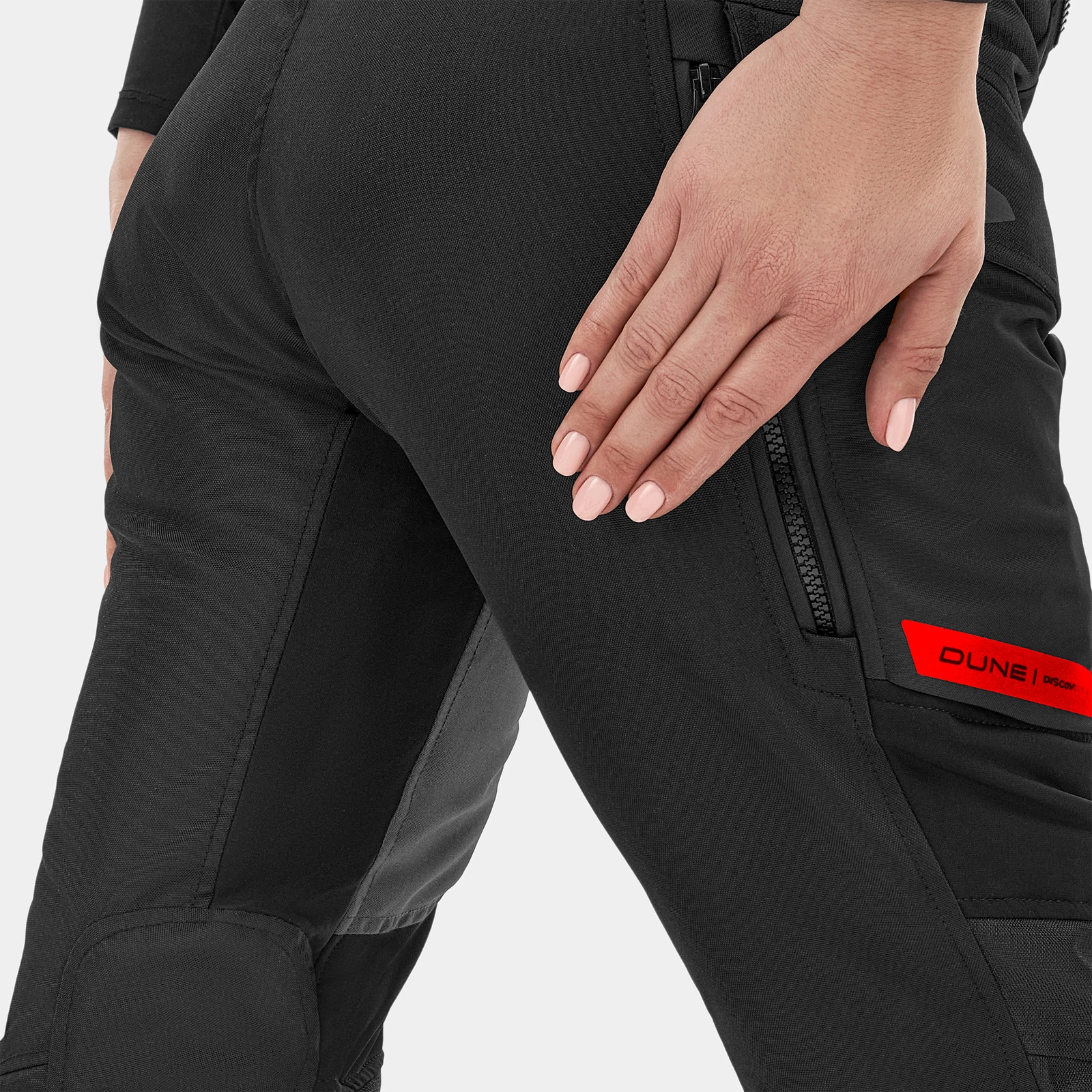 W okolicach kolan, bioder oraz na końcach nogawek umieszczono rzepy, które pozwalają na szybkie dopasowanie odzieży do ciała, gwarantując komfort oraz stabilność podczas ruchu. Elastyczny panel w okolicach lędźwiowych zapewnia większą swobodę ruchów. Ponadto, damskie spodnie Shima Dune Lady zostały wyposażone w zamki umożliwiające połączenie z kompatybilną kurtką Shima i stworzenie funkcjonalnego zestawu motocyklowego.