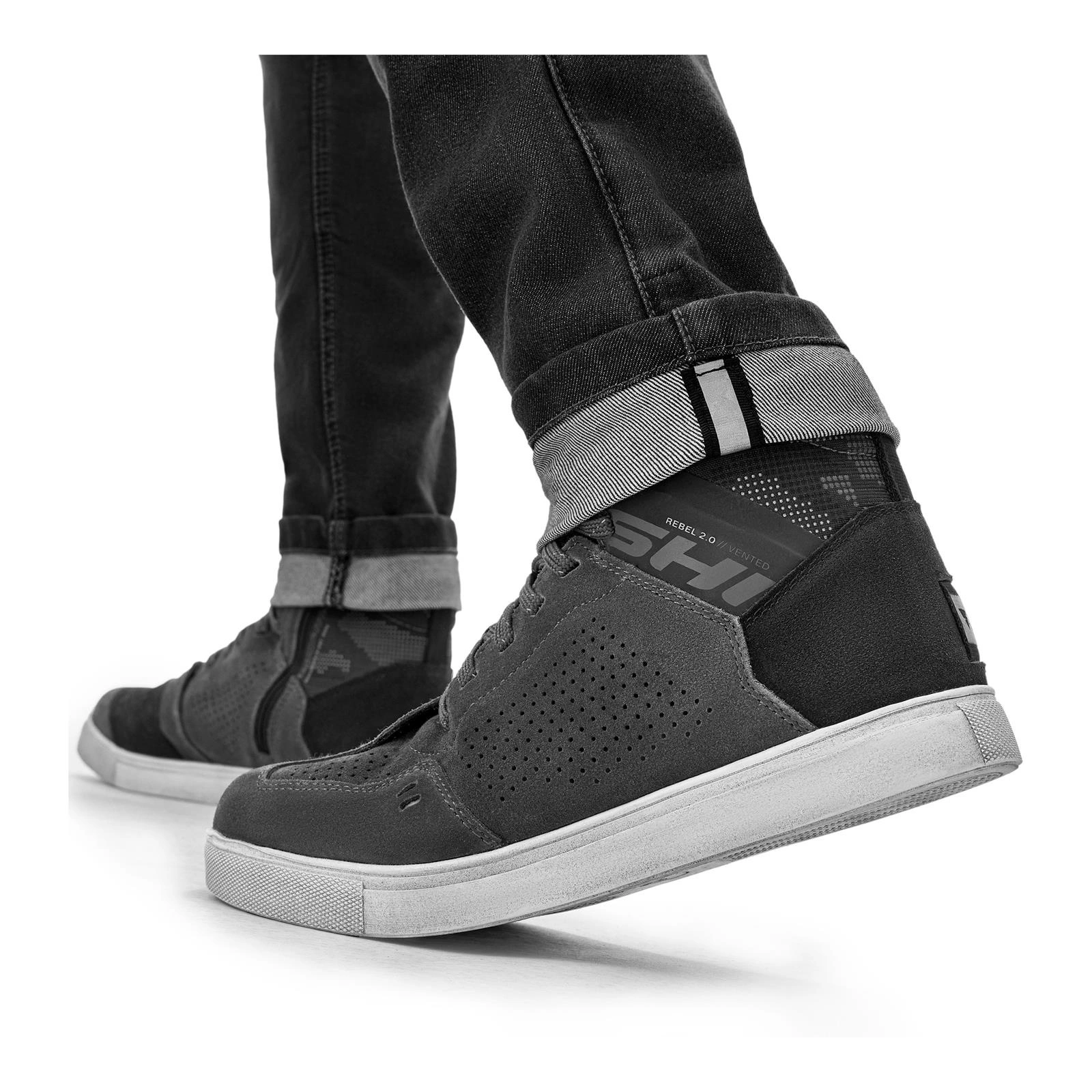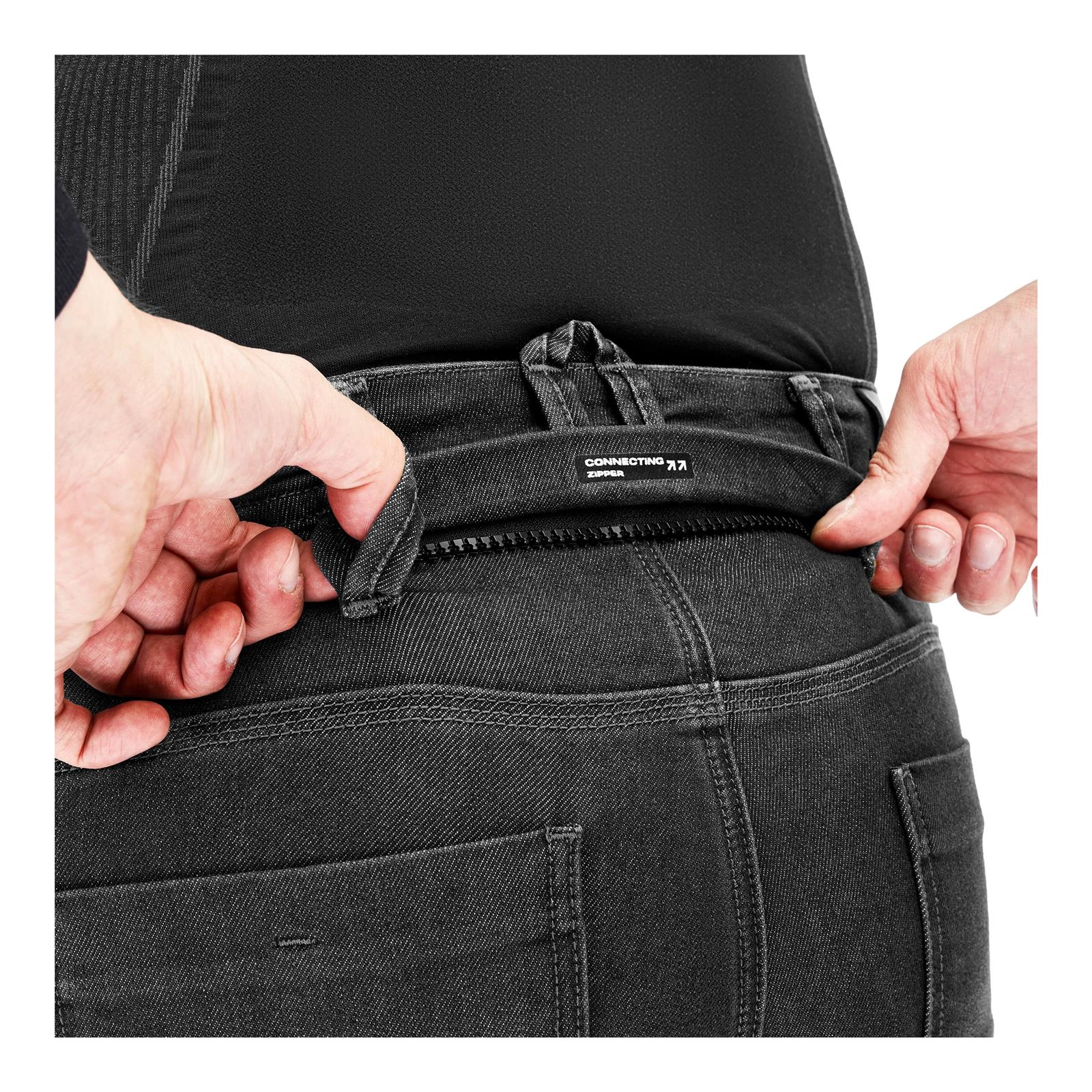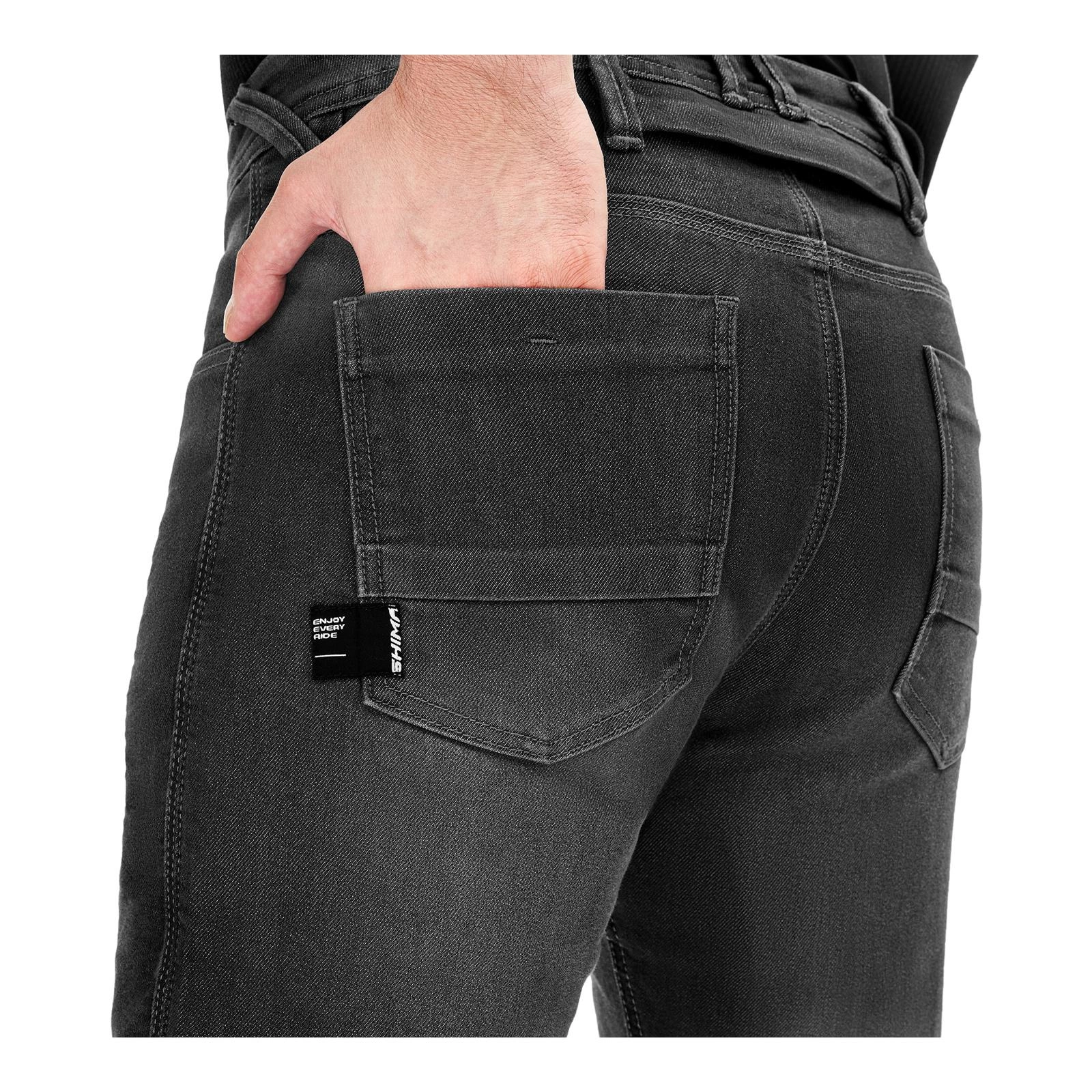 Wywinięcie nogawek ujawnia dyskretnie ukryte elementy odblaskowe, które zwiększają widoczność motocyklisty podczas jazdy. Pętelka oraz krótki zamek umożliwiają wygodne połączenie spodni z kurtką Shima. Z tyłu spodni znajdują się dwie klasyczne kieszenie, a przednie posiadają dodatkową przegródkę na monety. Wszystko to jest uzupełnione o stylowy karabińczyk, który pełni funkcję praktycznego akcesorium, pozwalając na przypięcie kluczy czy innych małych przedmiotów.