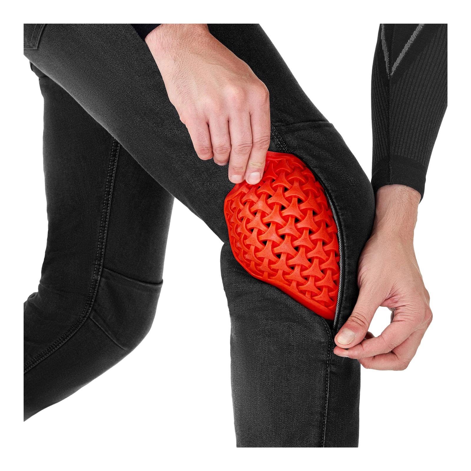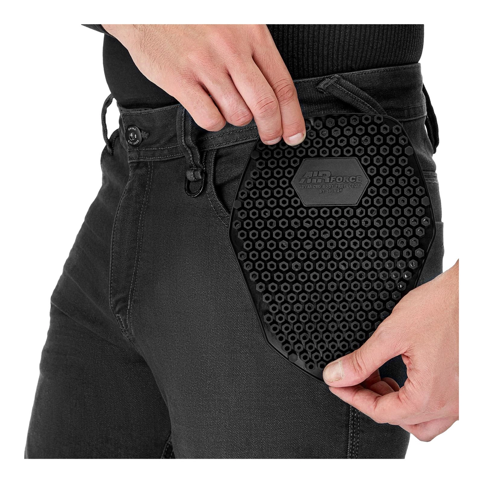 Jeansy motocyklowe Shima Ridge oferują najwyższy poziom ochrony potwierdzony certyfikacją AAA. Protektory kolan GFLEXX CE-level 2 zapewniają elastyczność i efektywne pochłanianie energii uderzenia, a system regulacji wysokości z rzepami umożliwia ich precyzyjne dopasowanie. Ochraniacze bioder AirForce CE-level 1 gwarantują dodatkową ochronę.