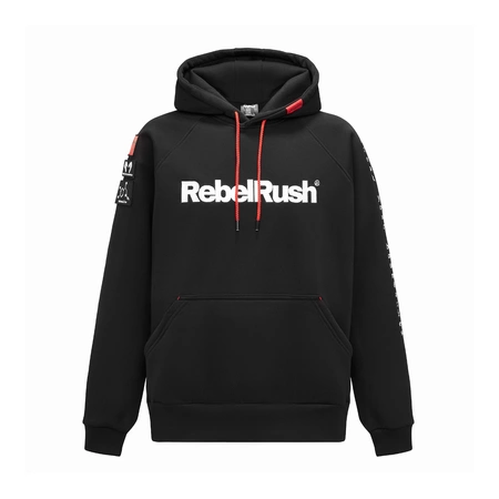 Bluza RebelRush Zip została wyprodukowana w Polsce z mieszanki 95% bawełny o wysokiej gramaturze 400 g/m² oraz 5% elastanu, zapewniając wygodę noszenia. Jej design wyróżniają haftowane napisy oraz haftowane i skórzane naszywki, które nawiązują do pasji związanej z motosportem. Na plecach znajduje się wyrazisty nadruk wykonany techniką sitodruku, który podkreśla unikalny charakter bluzy.