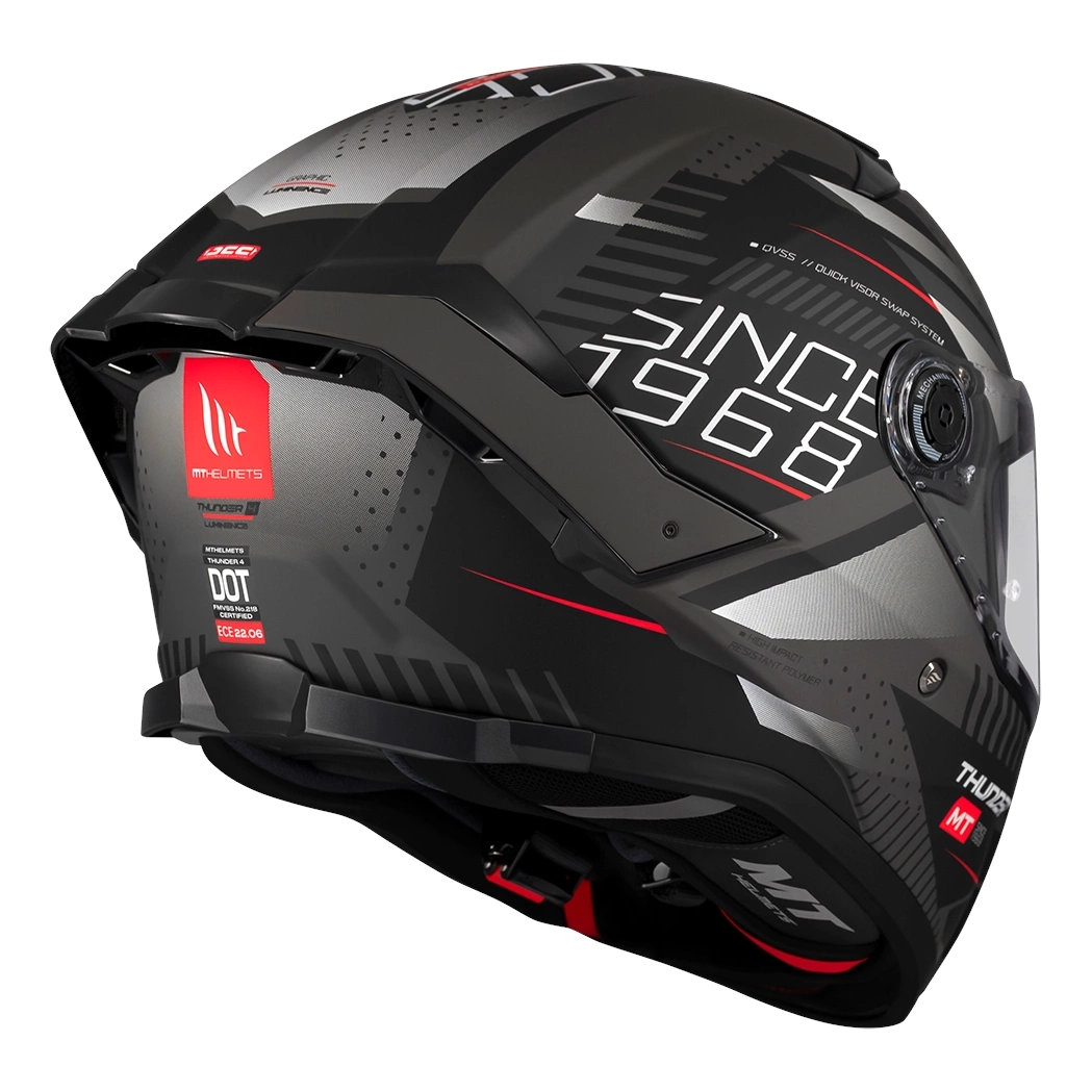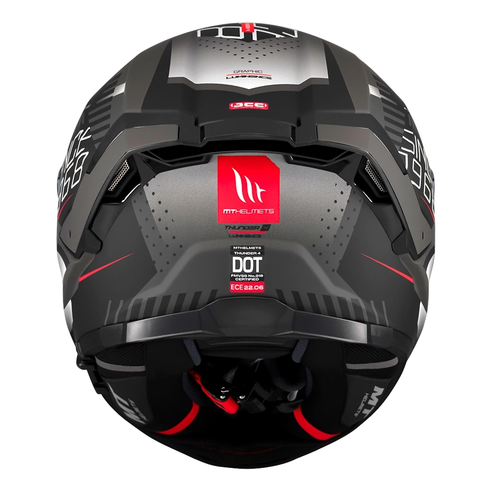 Kask spełnia rygorystyczną normę ECE R22.06, która obejmuje aspekty tłumienia energii przy uderzeniach oraz odporność na pęknięcia. Skorupa kasku MT Thunder 4 SV, o mocno aerodynamicznym kształcie, została wykonana w technologii High Impact Resistant Polymer, czyli z odpornego na uderzenia polimeru. Ponadto, kask wyposażony jest w demontowalny tylny spoiler, dzięki czemu zachowuje stabilność nawet przy dużych prędkościach.